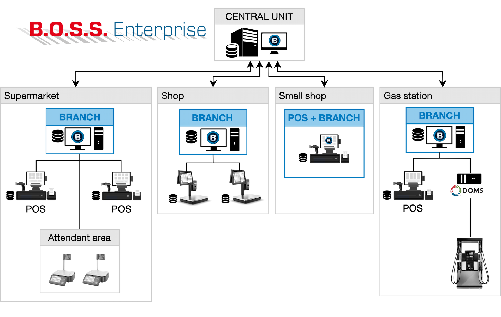 A special type of branches are for example counter shops with weighted items (meat, sausage, vegetables) where the system is integrated directly into the counter scales. Another specialized type of shop is a petrol station where typical petrol station technology such as petrol pumps, price sign totems, level gauge in tanks or self-service fuelling terminals are connected.
